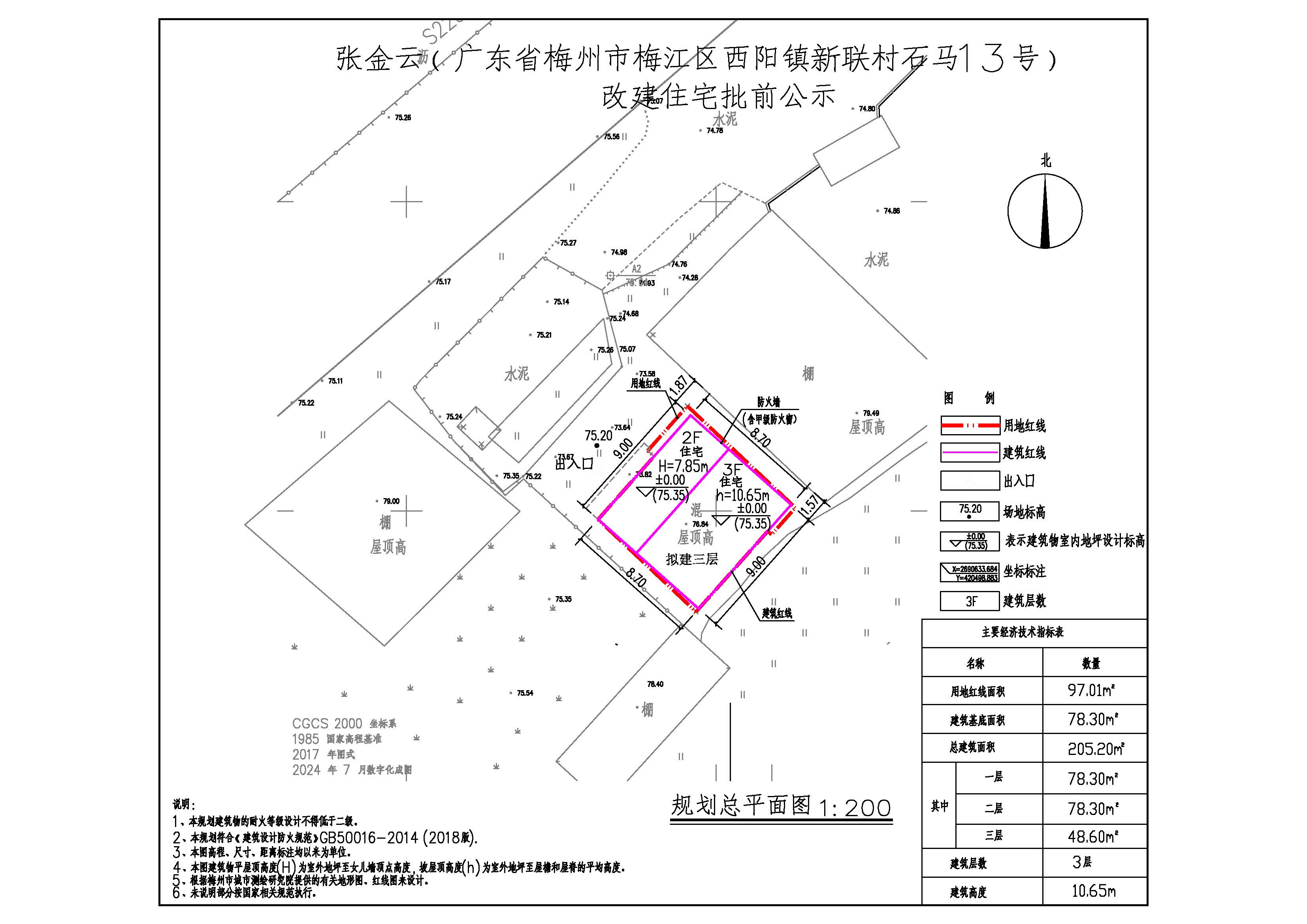 張金雲原房屋位於廣東省梅州市梅江區西陽鎮新聯村石馬13號,現張金雲業主擬對廣東省梅州市梅江區西陽鎮新聯村石馬13號房屋進行改建。具體報建方案為:建築基底麵積:78.30平方米,層數:3層,總建築麵積:205.20平方米。本圖僅為示意圖,準確數據以最後審批為準。