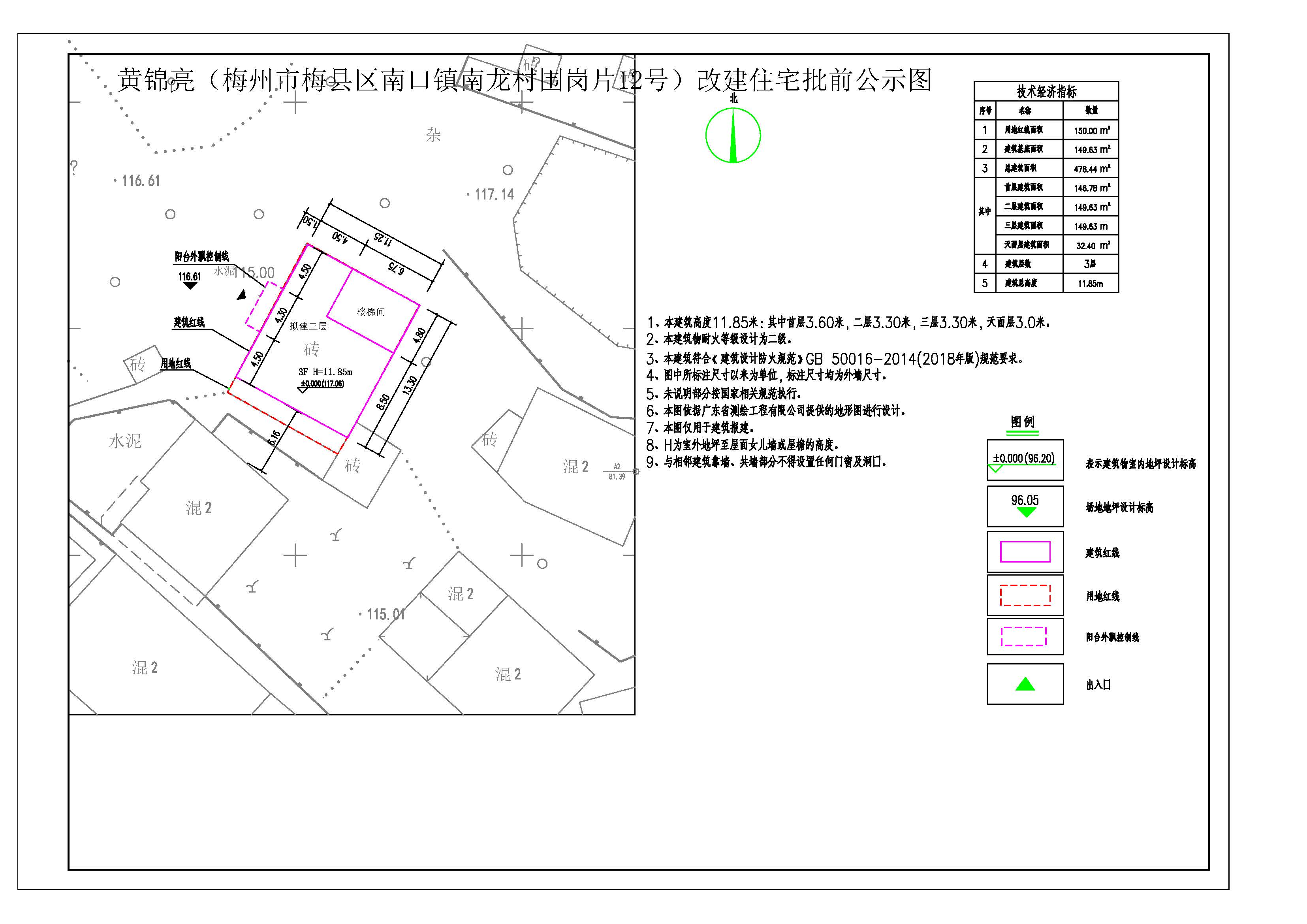 黃錦亮原房屋位於梅州市梅縣區南口鎮南龍村圍崗片12號,現黃錦亮業主擬對梅州市梅縣區南口鎮南龍村圍崗片12號房屋進行改建。具體報建方案為:建築基底麵積:149.63平方米,層數:3層及天麵樓梯間,總建築麵積:478.44平方米。本圖僅為示意圖,準確數據以最後審批為準。