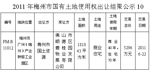 梅州市人民政府門戶網站 梅州市自然資源局 土地交易 2011年梅州市國有土地使用權出讓結果公示10