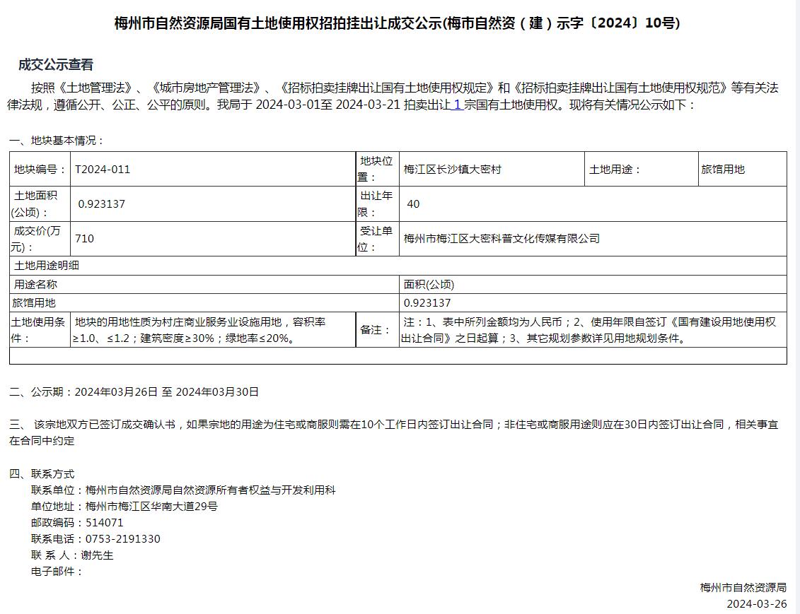 梅州市自然資源局國有土地使用權招拍掛出讓成交公示(梅市自然資(建)示字〔2024〕10號)