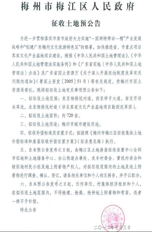 梅州市人民政府門戶網站 梅州市自然資源局 征地公告 客產園征地預公告