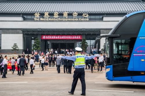 大會期間,民警在世界客商中心門前指揮車輛通行,維護交通秩序。