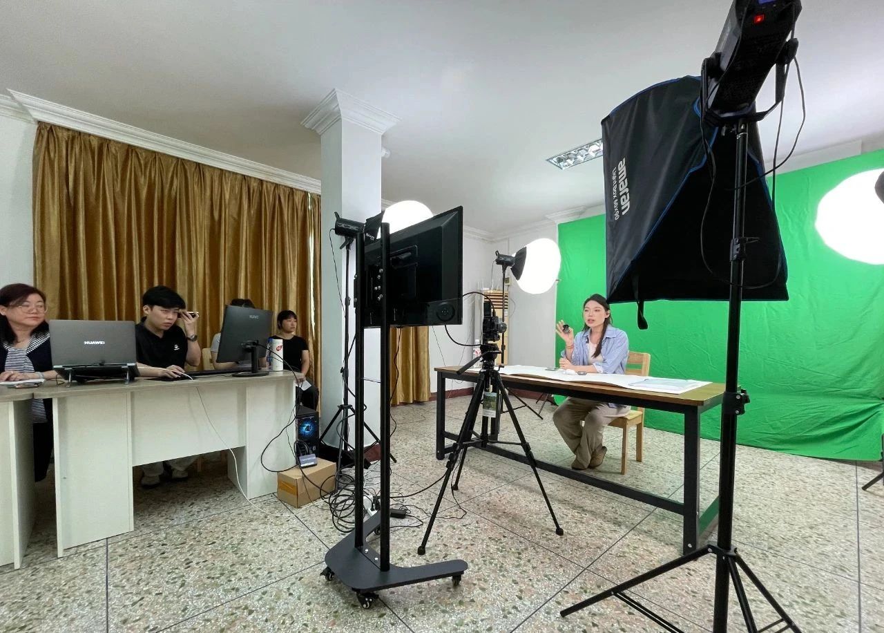 潭江鎮政府躍達科技展銷室寬敞明亮,一張張嶄新的辦公桌整齊有序地擺放著,成像設備、光控設備等直播設備一應俱全,水電及網絡等基礎設施配置周全。