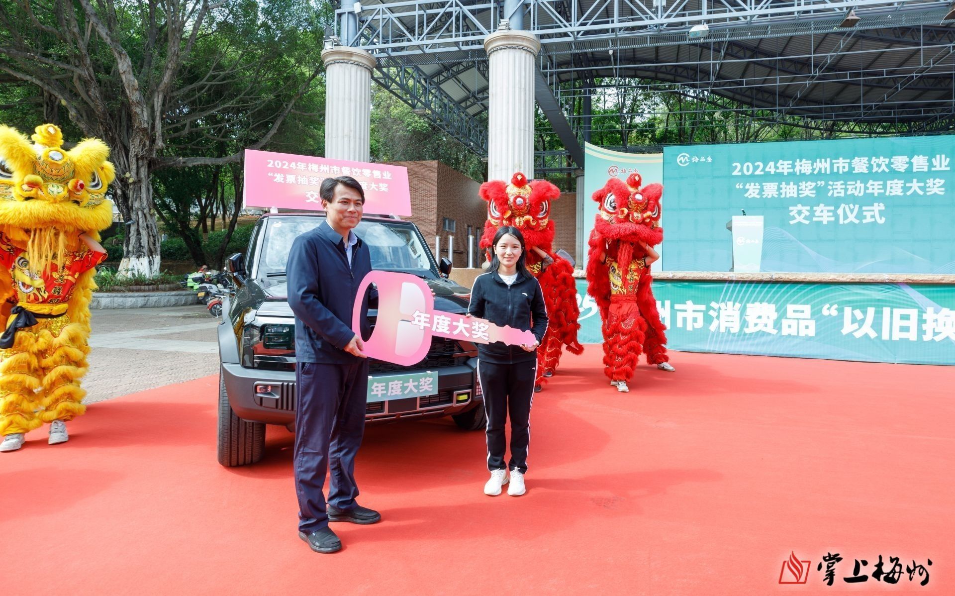 現場舉行2024年梅州市餐飲零售業“發票抽獎”活動年度大獎交車儀式。