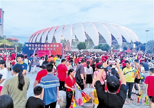 值得一提的是,今年8月初,五華長樂足球街啟用,為市民、球迷提供了一個集旅遊、休閑、娛樂、看球等功能於一體的打卡“網紅地”,助推了消費提振複蘇。據介紹,五華長樂足球街依托該縣深厚的足球文化,以中超主場賽事舉辦為契機,投資近1000萬元打造“足球+美食”相融合的夜市。長樂足球街位於五華奧體中心旁,總占地麵積1萬多平方米,引進商鋪48家、攤鋪150家,彙聚了五華特產、各地特色小食,是一個集主題遊樂、文化娛樂、休閑美食購物於一體的綜合性夜市。