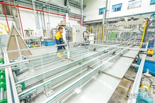 梅州聖戈班生產車間內,自動化生產線忙碌運轉。(吳騰江 攝)
