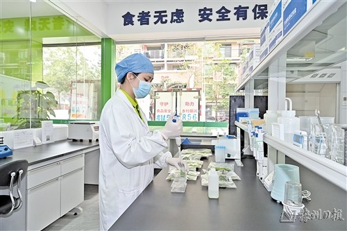 廣東供銷放心農產品直供配送豐順子平台檢驗檢測中心,檢測員對各類農產品進行檢測、留樣。(鍾小豐 攝)