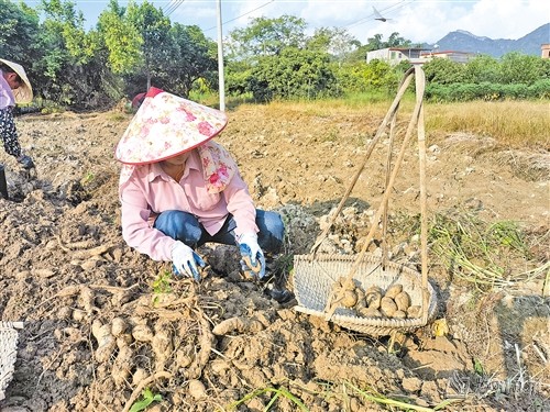 黃加占介紹說,他種植番薯已有20多年,從一開始種植幾畝發展到現在的60多畝,已積累了不少種植經驗。眼下豐收的番薯品種“白皮紫薯”,就是他經過長期摸索和學習結出的“碩果”,畝產量能達到2000斤至2500斤。“我就住在附近,有空的時候就過來幫一下忙,賺一點補貼家用,一天工資有150塊錢。”正在加占家庭農場幫忙的村民黃大哥表示,在家門口就業特別好,可以實現務農、顧家、賺錢“三不誤”。