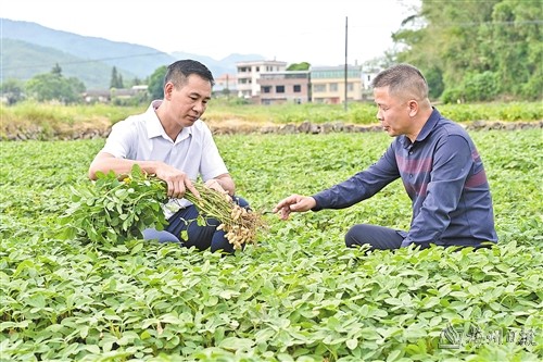 種植大戶黃純華(右)和東石鎮明洋村黨支部書記劉寶申在檢查東石花生的生長情況。