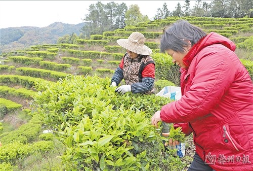 茶葉產業的逐漸興旺也有力帶動當地不少村民務工增收。走進同樣位於棉洋鎮的七佘徑鬆崗嶂綠色生態茶園,一株株茶樹間,工人正忙著采摘茶葉。廖弼英是棉洋鎮綠水村村民,每逢采茶時節,她都前來茶園務工,每天有200多元的采茶收入。據茶園負責人李等祥介紹,茶園每年都需要600人采茶製茶,帶動效應明顯。