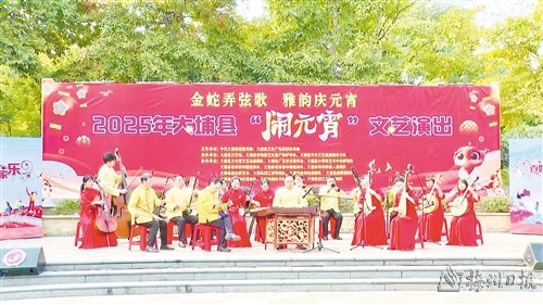 大埔縣西湖公園文藝演出現場,廣東漢樂《百家春》作為重頭戲登場,弦音悠揚,古韻四溢。