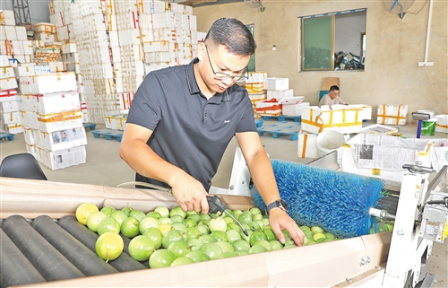 豐收的背後,既有自然的饋贈,也離不開科技賦能的助力。來到該村占地300多平方米的葉田源百香果分揀中心,記者看到,新投入的果蔬自動分揀設備智能生產線正高速運轉,百香果先經清水池清洗,再被傳送到不同的指定地點。“我們順應市場化要求,對果實分類進行了標準化升級,這套分揀設備可以根據果實的重量分揀不同級別的百香果,分為特大果、大果、中果、小果四個等級。”楊誠告訴記者,自動分揀設備的引入不僅提高了工作效率,節省了人工成本,還使得果實分類更加標準化,分揀出的果實大小均勻、品相上乘。