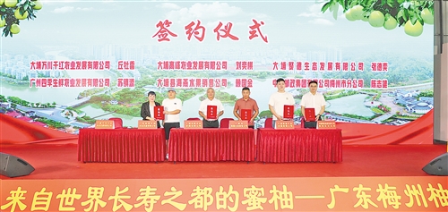 2025年梅州柚(大埔蜜柚)開采活動暨銷售推介會現場,蜜柚企業與經銷商簽約。