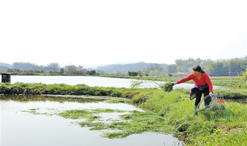 村民在給魚投喂草料。(圖片來源:梅州日報 吳麗伶 攝)
