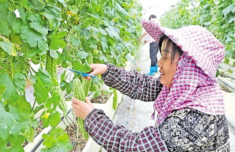 菜農在采摘苦瓜。(圖片來源:梅州日報 高訊 攝)
