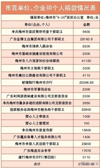 今年是“6·30”活動開展的第14個年頭,主題為“鞏固脫貧成果、助力鄉村振興”。連日來,我市各級各部門和社會各界弘揚守望相助、樂善好施的傳統美德,積極參與“6·30”助力鄉村振興活動,為助力梅州鄉村全麵振興,實現城鄉高質量發展、百姓增收共富彙聚強大力量。據統計,截至7月3日,市直單位、企業和個人共計捐款97.32萬元。下來,本報將持續更新相關數據。