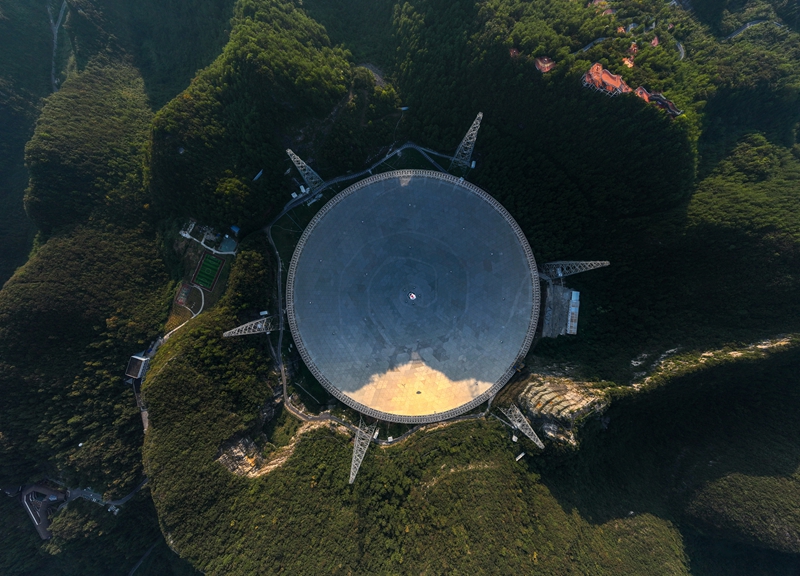中國天眼在落日餘暉中(無人機照片,維護保養期間拍攝,2024年9月25日攝)。新華社記者 劉續 攝