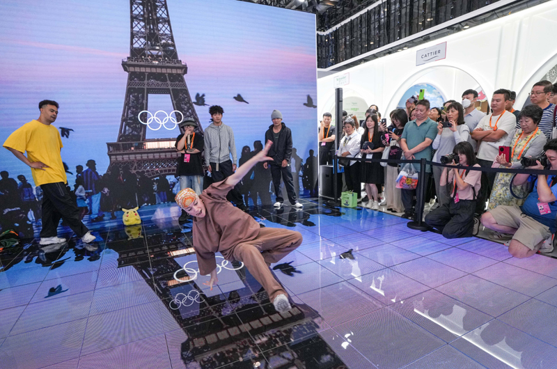 2024年9月14日,在2024年服貿會國家會議中心綜合展區的主賓國法國展台,中法兩國街舞好手在表演霹靂舞。新華社記者 陳曄華 攝