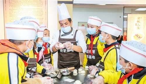 “揉麵團,擀麵皮,包肉餡,上蒸籠……”當天上午,金山小學師生與包點老師齊聚“粵菜師傅”工程研學基地,包點老師手把手教大家如何擀麵、包餡。活動現場歡聲笑語,大家忙得不亦樂乎。研學活動成了學生學習勞動技能、進行德育實踐的生動課堂。