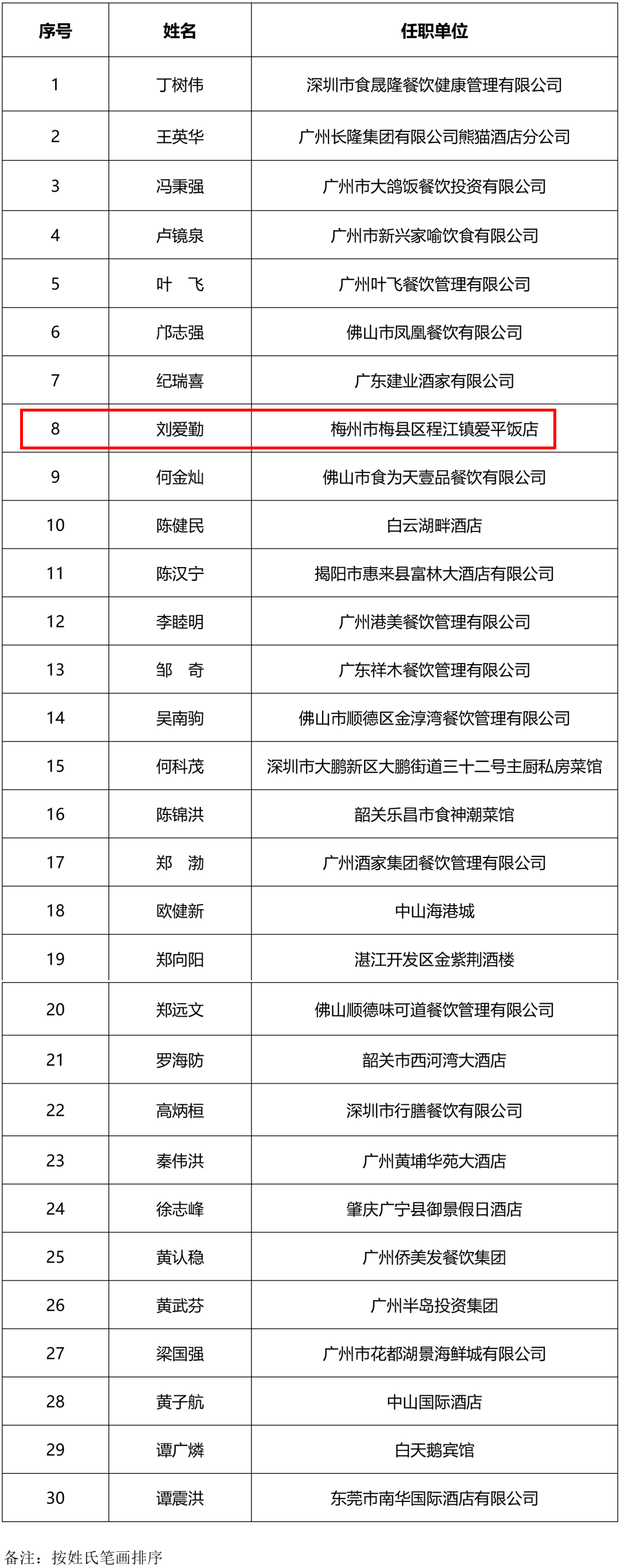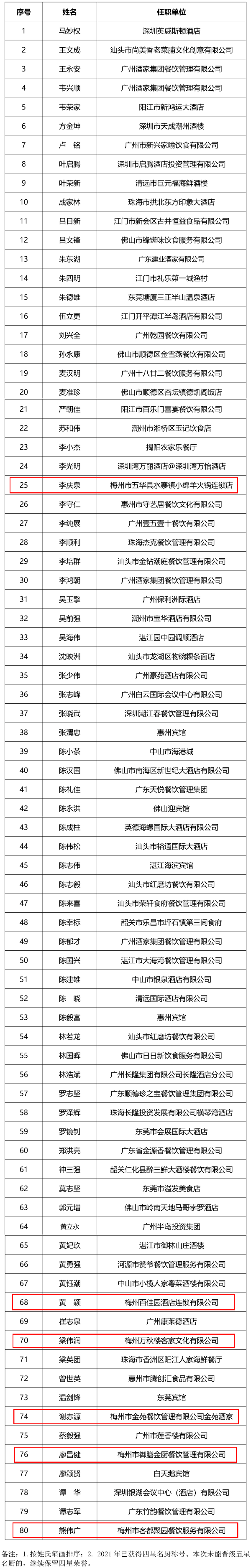 經專家評選委員會通過資料評審、線上展示、專家評審等環節,2022年廣東省五星級、四星級“粵菜師傅”名廚認定結果新鮮出爐!此次共認定五星級“粵菜師傅”名廚30名,四星級“粵菜師傅”名廚80名,梅州的劉愛勤獲得2022年廣東省五星級“粵菜師傅”名廚,李慶泉等6人獲得2022年廣東省四星級“粵菜師傅”名廚。具體名單如下: