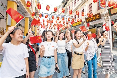 “五星紅旗迎風飄揚,勝利歌聲多麼響亮……”10月1日,在梅城老街淩風路步行街、梅江區院士廣場和梅州市文化館群星舞台,由市委宣傳部組織的多場歌曲“快閃”活動精彩上演。當演員們唱響《歌唱祖國》《我和我的祖國》《愛我中華》等愛國歌曲時,耳熟能詳的旋律在四周回蕩,市民和遊客紛紛停下腳步,揮舞著手中的國旗喝彩,加入合唱隊伍,這些歌詞描繪出的美好畫麵喚起大家對祖國大好河山的無限熱愛和對美好生活的向往。