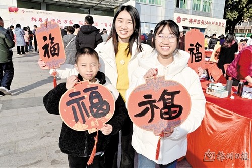 活動現場擺開長桌,墨香四溢,熱鬧非凡,主辦方邀請市書法家協會和梅州畫院的書畫名家潑墨揮毫,為市民義務書寫飽含著祝福的春聯和各式“福”字,並邀請市民一起現場即興揮毫繪彩,共繪“百花迎春”圖,為即將到來的新春佳節增添喜慶氛圍。另一旁,來自市美術家協會、市民間文藝家協會的文藝誌願者耐心指導市民體驗非遺傳統剪紙和創意泥塑,經過一把小刀、一雙巧手的一番操作,不一會兒工夫,一個個栩栩如生的泥人兒和一張張喜慶吉祥的剪紙就成型了。