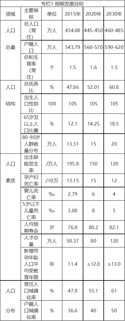 到2020年,全麵兩孩政策效應充分發揮,生育水平適度提高,人口素質不斷提升,人口結構逐步優化,人口分布更加合理,全市常住人口城鎮化率達到55.1%,構成規模等級結構合理的城鎮體係。到2030年,人口自身均衡發展的態勢基本形成,人口與經濟社會、資源環境的協調程度顯著提高,全麵建成適應城鄉經濟社會發展的基礎設施體係,實現城鄉融合發展。