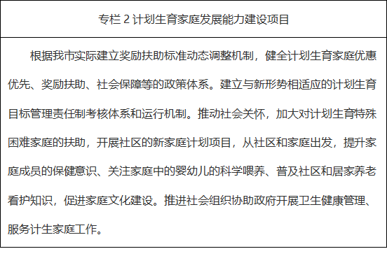加大對計劃生育家庭的扶助力度。完善計劃生育家庭獎勵和扶助政策體係,對全麵兩孩政策實施前的獨生子女家庭和農村計劃生育雙女家庭,繼續實行現行各項獎勵扶助政策,在社會保障、集體收益分配、就業創業、新農村建設等方麵予以傾斜。加大對計劃生育家庭扶助力度,增強對計劃生育特殊困難家庭的幫扶力度。完善包括生育支持、幼兒養育、青少年發展、老人贍養等在內的家庭發展政策,廣泛開展創建幸福家庭活動和新家庭計劃。