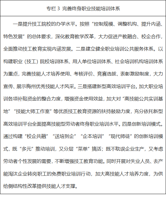 加強培訓和轉移力度。一是加強職業技能培訓力度。以新成長勞動力、城鄉富餘勞動力、失地農民等為重點培訓對象,以企業在崗職工技能培訓為抓手,采取開發公益性崗位安置、優先推薦就業、開展公共就業服務專項活動等措施,健全以企業為主體,技工院校和社會各類培訓機構共同參與的職業培訓網絡,推動實現更高質量就業,助推企業轉型升級。二是完善勞動力轉移就業機製。加強與珠三角地區對口勞務幫扶和勞務對接,將勞動力技能培訓與助推產業轉型升級緊密結合,圍繞重點區域、重點園區、重點產業開展針對性培訓,促進我市勞動力充分轉移,推動梅州振興發展。三是完善創業培訓體係。鼓勵有創業要求和培訓願望、具備一定創業條件的城鄉各類勞動者,以及處於創業初期的創業者參加創業培訓,提高勞動者創業能力。