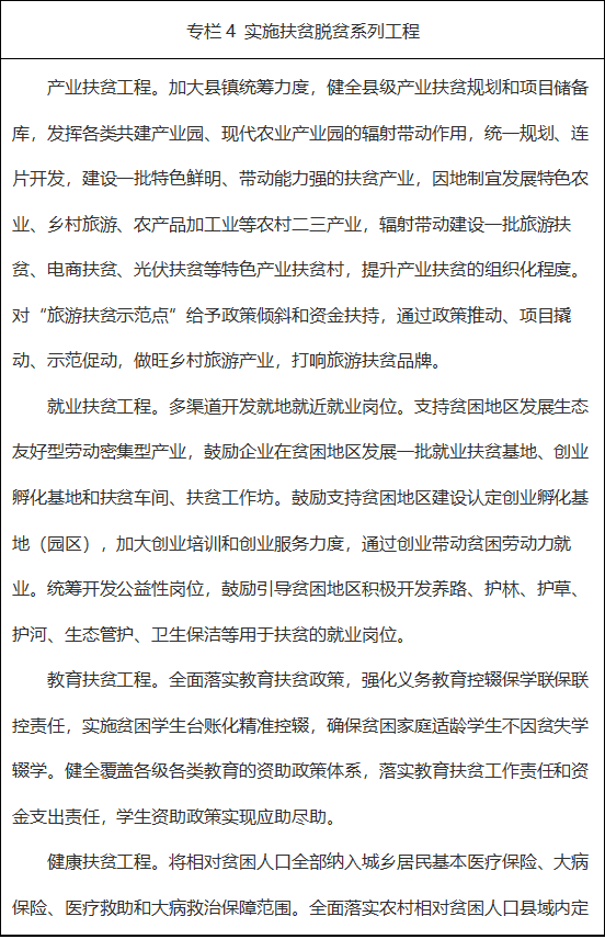 實現貧困人口動態脫貧。深入實施脫貧攻堅,通過發展生產、就業扶持、生態補償、教育支持、社保兜底、醫療救助、基礎設施建設、金融服務、組織社會扶貧等有效措施,舉全市全社會之力堅決打贏脫貧攻堅戰,確保到2020年,農村相對貧困人口如期脫貧、相對貧困村全部出列。加強建檔立卡工作,健全貧困人口精準識別與動態調整機製。創新扶貧脫貧服務管理機製,形成政府、企業和社會等多方力量協同發力的大扶貧格局。積極探索符合我市實際的貧困人口治理體係,推動扶貧開發由緩解相對貧困向實現全麵小康轉變,由主要解決農村貧困向統籌解決城鄉貧困轉變。積極利用對口幫扶機製,在產業合作、勞務協作、人才支援、資金支持等方麵尋求支持,到2030年,我市與全省發展水平的差距顯著縮小,共同富裕程度顯著提升。
