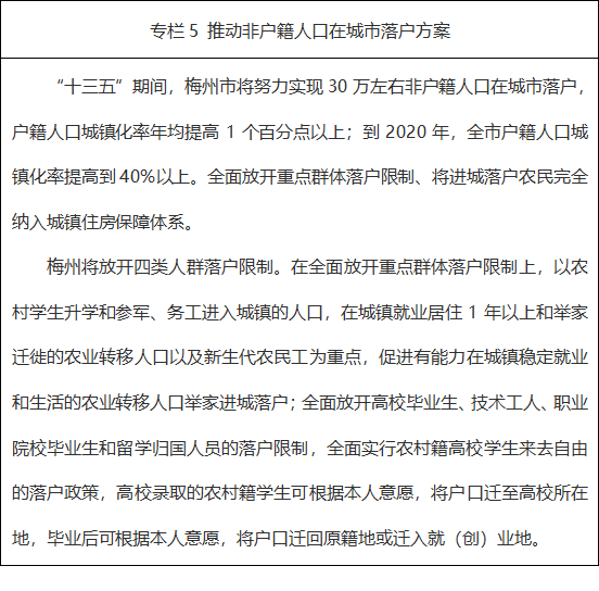 ——注重人口與社會協調發展。按照屬地化管理、社區化服務的原則,不斷完善基本公共服務製度體係和工作機製,推動基本公共服務常住人口全覆蓋,有序推進農業轉移人口市民化,不斷提升以人為核心的城鎮化水平。著力補齊重點人群發展短板,構建以家庭為基礎、社區為依托、機構為補充、醫養相結合的多層次養老服務體係;保障婦女兒童、殘疾人合法權益;實施貧困人口精準脫貧,消除絕對貧困,縮小貧富差距;促進社會公平正義,增進人民福祉。推動人口與衛生健康工作向政府、社會和公民多元共治模式轉變,促進梅州市人口與社會協調發展。