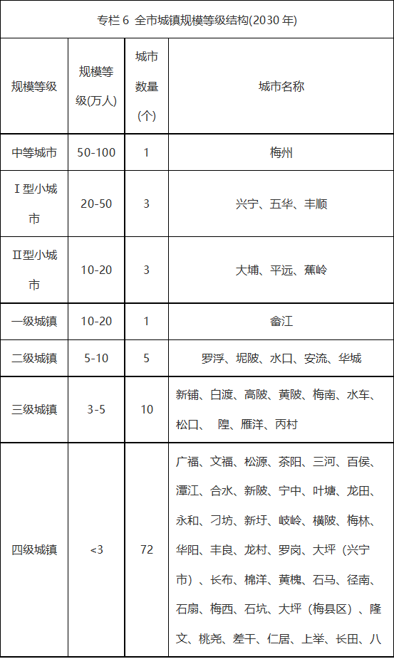 ——人口分布。人口流動合理有序,人口分布與區域發展、主體功能布局、城鎮發展、產業集聚的協調度達到更高水平。 梅州市深化“一區兩帶六組團”建設,構建“五星爭輝”區域發展新格局基本形成,人口向梅州中心城區、縣城和產業園區集聚態勢更加明顯。