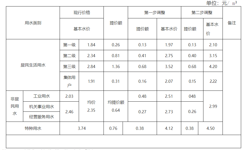 居民生活用水基價2.10元/立方米,第二級水價3.15元/立方米,第三級水價4.20元/立方米;居民生活用水的集體用戶水價2.22元/立方米。非居民用水價格2.99元/立方米。特種用水價格4.50元/立方米。水價調整分兩步實施(詳見附表)。