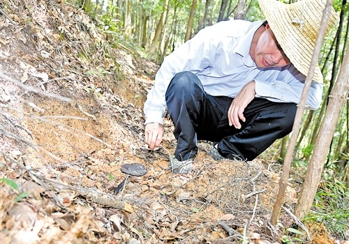 謝文生在林下靈芝種植基地查看靈芝的生長成熟度。(圖片來源:梅州日報 袁誌鵬 攝)