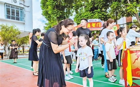 在蕉嶺縣友邦小學,老師們用筆蘸上朱砂,在孩子們的額頭正中點上“紅痣”,意為“啟智”,寓意開啟學童智慧,推開知識的大門。隨後,孩子們在老師的引導下參加進智慧門、敲啟智鼓、學寫“人”字等活動,感受傳統文化的魅力。