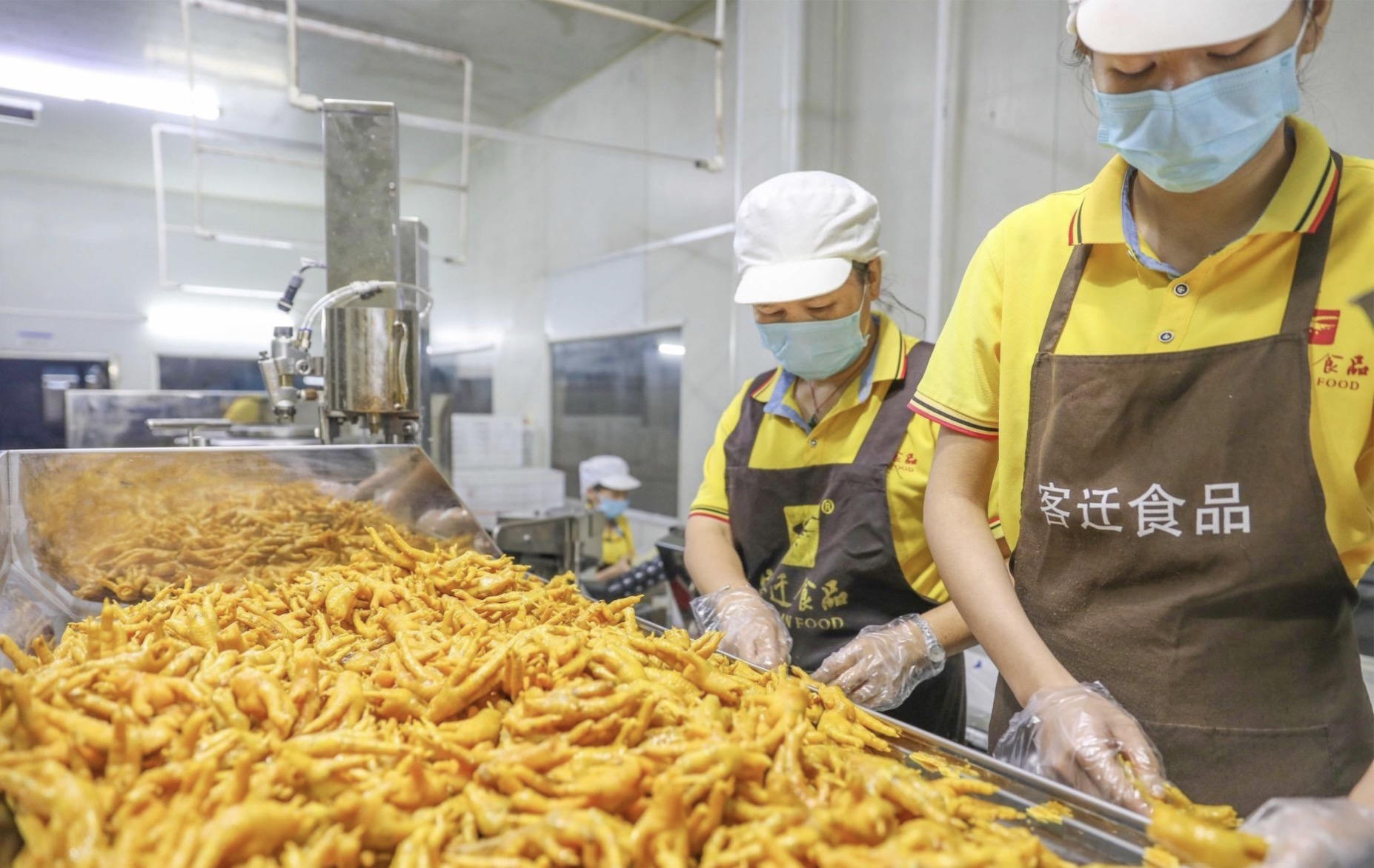 中秋、國慶黃金周臨近,走進客遷食品有限公司的丙村加工廠,映入眼簾的是工人們忙碌的身影,經過清洗、醃製、熟製、放涼、真空包裝、滅菌、外包等工序,鹽焗雞等客家特色美食新鮮出爐,準備運往全國各地。客遷食品總經理溫海經告訴記者,公司自2013年成立以來,創新研製了鹽焗食品、木捶肉丸、臘味等係列食品,在廣東、江西、湖南等地十分暢銷。“企業年銷售額約4000多萬元,我們通過實體門店、經銷商、網絡直播等渠道推廣銷售,銷量最高的一場直播賣出4萬多包鹽焗食品。”溫海經說,在丙村鎮支持下,企業已發展成為梅州地區同行業的佼佼者,企業將不斷更新生產線,擴大產能提升質效,讓更多遊子和食客品嚐地道的“梅州味”。