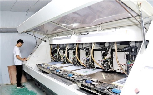 梅州市智航興電子有限公司生產車間工人正在操作設備。(丘林強 攝)