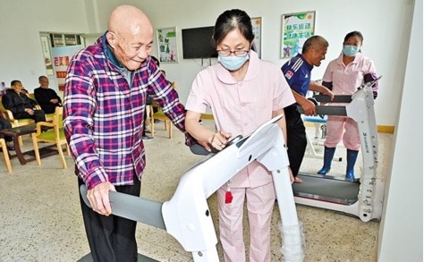 熱柘鎮敬老院的工作人員用全新的康複設備幫助老人運動。