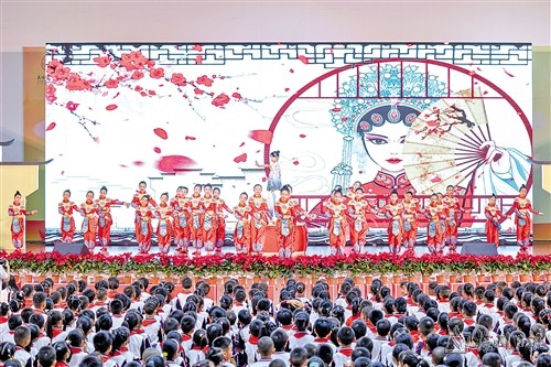 活動在該校黨總支部書記古芹巧祝辭和校長黃粵英的宣布下,以一部精彩的宣傳短片拉開活動帷幕。展演活動中,一二年級小朋友表演的情景舞蹈《雅言雅行伴我成長》充分展示了桂嶺學子的雅言雅行風采,家長代表們帶來的情景劇《文明在哪裏》展示了滿滿的正能量,小演員們用英文版《龜兔賽跑》上演精彩的童話故事,四年級同學的快板《數科潤色話桂嶺》,將傳統的快板和嚴謹的數學完美結合,美術組將傳統與現代相結合,先後開展剪紙、掐絲琺琅等傳統課程,讓學校的美育大放異彩。伴隨《生日歌》響起,全校師生與來賓共享喜悅與榮光。(記者 劉炳發)