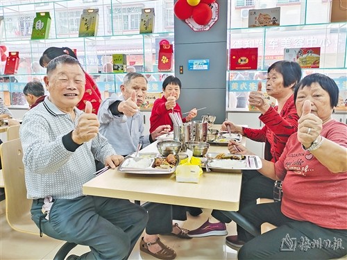 興寧市“長者飯堂”內用餐的老人豎起拇指連連稱讚。