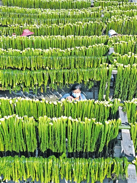 12月7日,記者走進黃沙村的田間地頭,隻見半人高的梅菜長勢喜人,村民們正在進行收割;梅菜加工廠裏,漂燙機“嗡嗡”作響,新鮮的梅菜經過清洗和蒸煮,散發出獨有的清香,菜農們正忙著將煮過的梅菜搬運到架子旁,在太陽下進行晾曬。