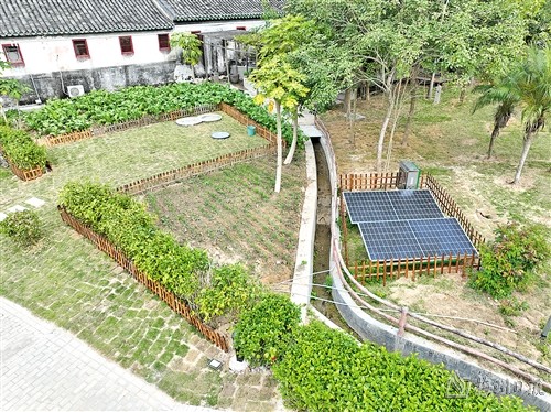 胡粵林介紹說,下北塘村民小組微動力強化預處理罐處理規模為10噸/日,在傳統“厭氧+沉澱”工藝設備的基礎上,增加了太陽能增氧裝置,利用自然能發電進行間歇曝氣增氧,有效降解汙染物,為資源化利用提供支撐,適用於較小聚居片的村莊。