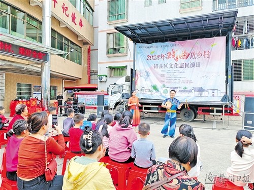 在長灘村的演出現場,杯花舞表演《杯花聲聲迎客來》、木偶表演《長綢舞韻》、山歌對唱《誇老公誇老婆》、男聲獨唱《客家阿媽》、山歌小戲《二梅看郎》等精彩節目輪番上演,吸引不少群眾駐足觀看,現場掌聲陣陣、喝彩不斷。“我們把文藝演出送到群眾家門口,每場演出形式多樣,滿足不同年齡階段群眾的需求,獲得了大家的喜愛。”梅縣區文化館相關負責人說。據統計,2023年戲曲進鄉村——梅縣區文化惠民演出共吸引了8000多名群眾觀看。