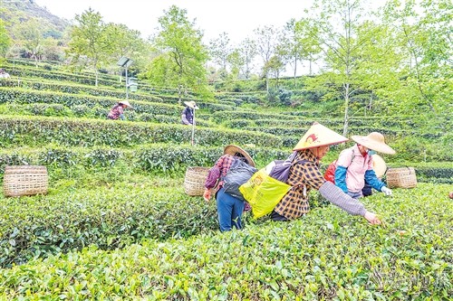 廣東韓山生態旅遊度假區內,茶農在茶田中采茶。