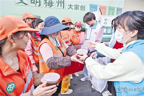 1月18日是我國傳統節日臘八節。當天,梅江區江南街道鴻都社區新時代文明實踐站開展“濃情臘八節,粥到暖人心”誌願活動,為一線工作的環衛工人送上熱氣騰騰的臘八粥。