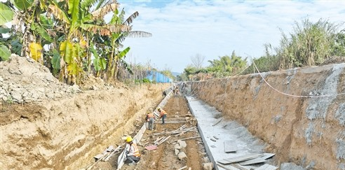 在蕉嶺縣石窟河沿岸灌(排)渠係改造工程三圳大排渠(吉塘段)施工現場,記者看到,幾十名工人正忙著紮鋼筋、釘模板、鋪水泥,挖掘機、渣土車等施工車輛來回穿梭,一片繁忙的施工場景。