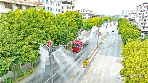 在G205蕉嶺縣穿城段,市民時常可在馬路邊上看到這樣“神奇”的一幕:細密的水霧從道路兩旁十餘座路燈杆高處噴湧而出,在城市半空中形成一片片“霧森”。這裏正是蕉嶺縣首批上線的智慧多功能燈杆噴霧係統所在地。