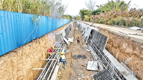 在蕉嶺縣石窟河沿岸灌(排)渠係改造工程三圳大排渠(吉塘段)施工現場,記者看到,數十名工人正忙著紮鋼筋、釘模板、鋪水泥,挖掘機、渣土車等施工車輛來回穿梭。“項目去年11月開工建設,預計2024年底建設完成。建成後將改善石窟河沿岸居民生活環境,緩解水浸內澇問題,同時將完善周邊鎮灌區供水體係,充分發揮灌溉效益,進一步優化水資源配置。”廣東水電二局股份有限公司項目施工經理張嘉倫介紹道,該工程位於蕉嶺縣長潭鎮、蕉城鎮、三圳鎮、新鋪鎮境內,總投資2.13億元。
