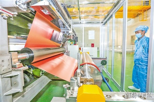 盈華電子科技年產4萬噸高端銅箔項目一期生產車間一角。(吳騰江 攝)