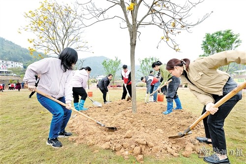 在大坪鎮潭坑村,原本雜草叢生的沿河堤岸,經過30多位黨員幹部挖穴、填土、澆水、固定……100來棵樹苗迎風挺立,在百米長堤上形成了一道亮麗的風景線。這是興寧市人大常委會黨員幹部的勞動成果。該市人大常委會黨組在春節前就專門研究部署,春節後第一時間組織動員機關黨員,聯合大坪鎮人大幹部、人大代表開展義務植樹活動,帶動廣大群眾積極植綠造綠。